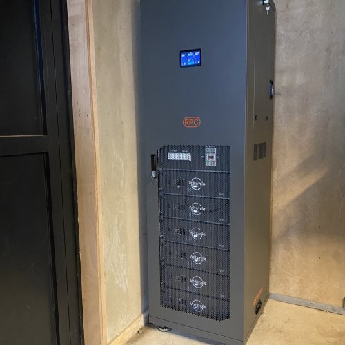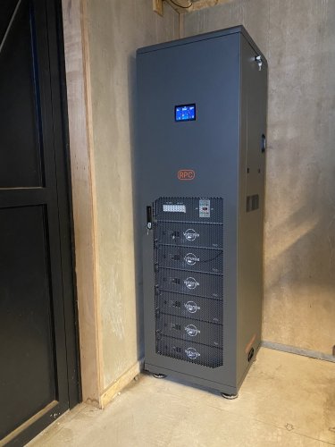 HPS-3 Goud met 30 kWh accuopslag. Het HPS-3 met de MultiPlus II 5000 omvormers kan 17A extra boven op de netaansluiting leveren zolang de accu's de extra stroom kunnen leveren. In de praktijk betekend dat een 3 x 43A verbruik mogelijk is. Daarnaast is er een Victron laadpaal geplaatst.