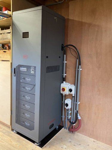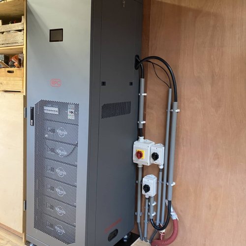 HPS-3 met MultiRS omvormers. Dit systeem kan 23A bovenop de 25A netaansluiting leveren zolang de accu's gevuld zijn met stroom. Hierdoor hoeft er geen netverzwaring te komen. In de toekomst kan er 18kWp aan zonnepanelen op de MultiRS en worden aangesloten.