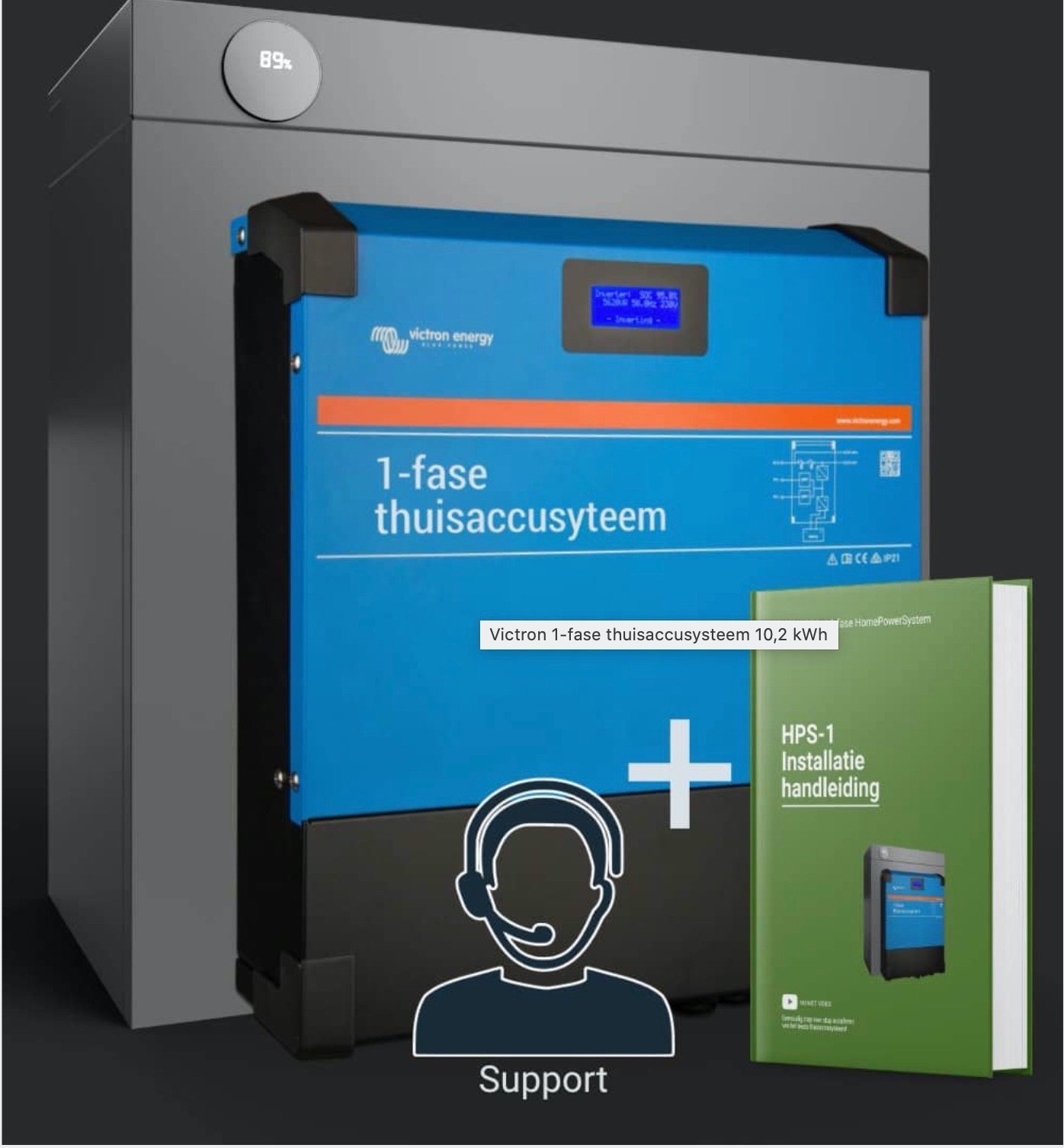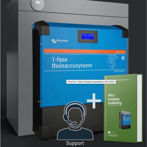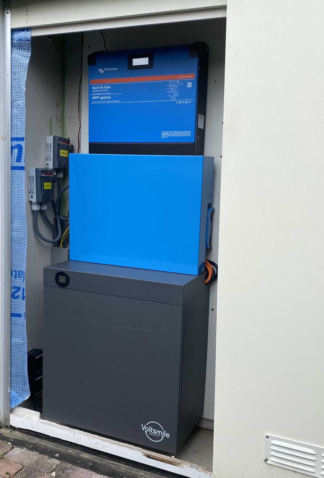 HPS-1 met 20 kWh accuopslag. Door fase compensatie kan dit systeem reageren wat er op alle drie de fasen gebeurd. Dit om zoveel mogelijk 0 op de meter te kunnen realiseren. Er worden 8 extra zonnepanelen direct aangesloten op de Multi RS van het HPS-1 systeem. In de toekomst is dit systeem uit te breiden naar 3 fasen.