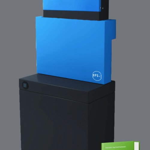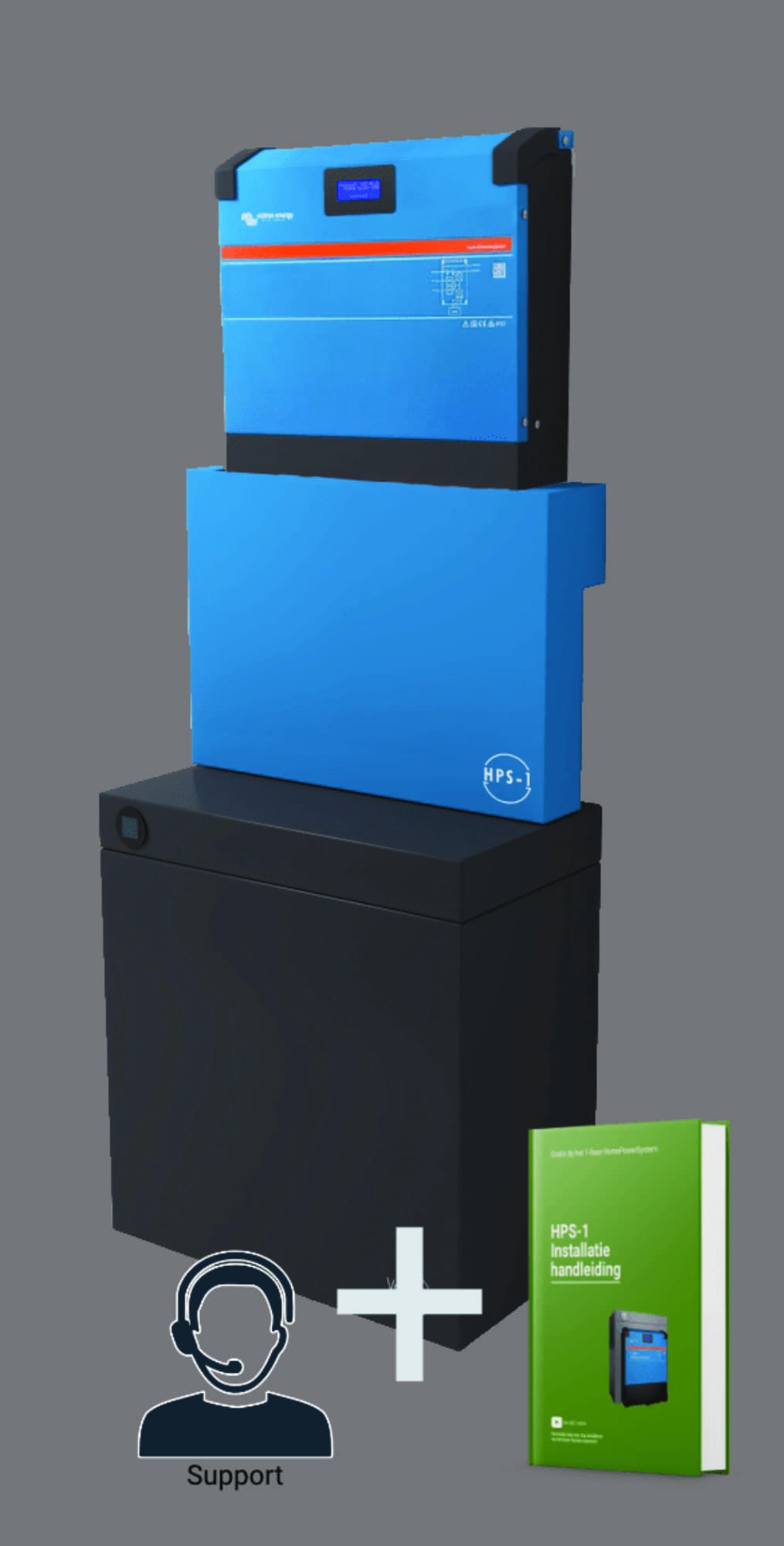 Gekozen is voor het HPS-1 systeem. Dit is een 1 fase systeem die op het verbruik van alle 3 de fases kan reageren en fase compensatie kan doen. Dit betekend dat het streeft naar 0 op de meter en wat er op 1 fase wordt verbruikt kan weer teruggeleverd worden op de fase waarop het HPS-1 is aangesloten. In een later stadium is dit systeem uit te breiden naar een 3-fase systeem. In het HPS-1 systeem zit een Victron Multi RS 6000 omvormer waarop direct 6000 Wp aan zonnepanelen kunnen worden aangesloten.